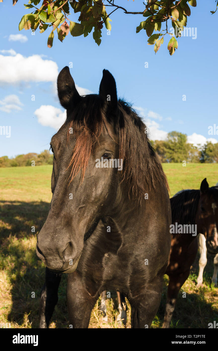 Bonita Foto De Perfil De Un Caballo Castano Bajo La Sombra De Los Arboles En Contra De Origen Rural De Campos En Nueva Jersey Fotografia De Stock Alamy